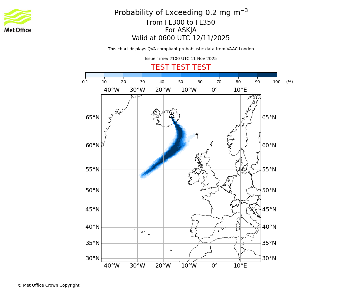 Probability of exceeding 0.2 milligrams per metre cubed. From 250 to 300 for ASKJA. Valid at 0600 UTC 12/11/2025