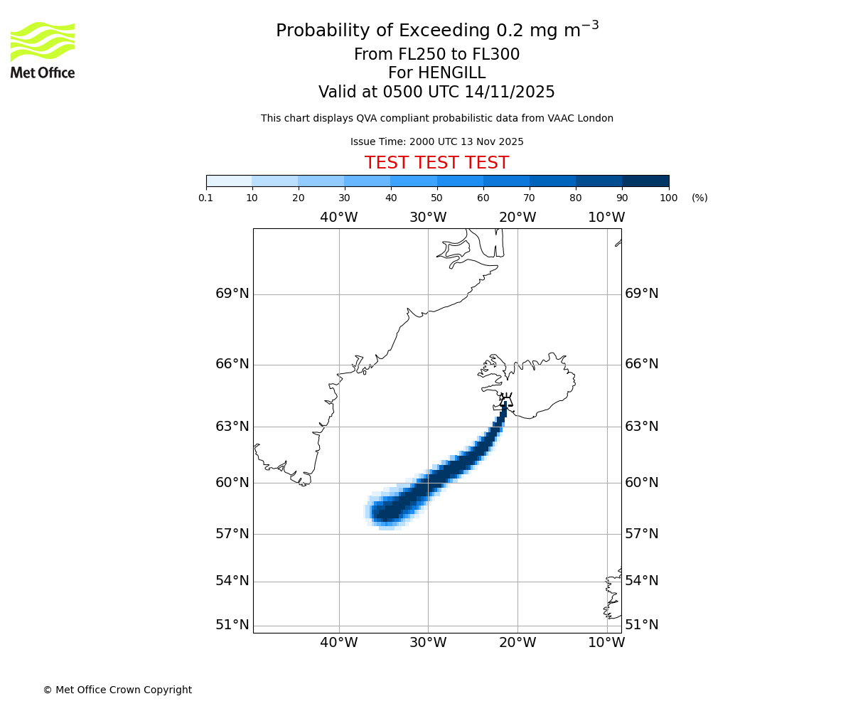 Probability of exceeding 0.2 milligrams per metre cubed. From 250 to 300 for HENGILL. Valid at 0200 UTC 14/11/2025