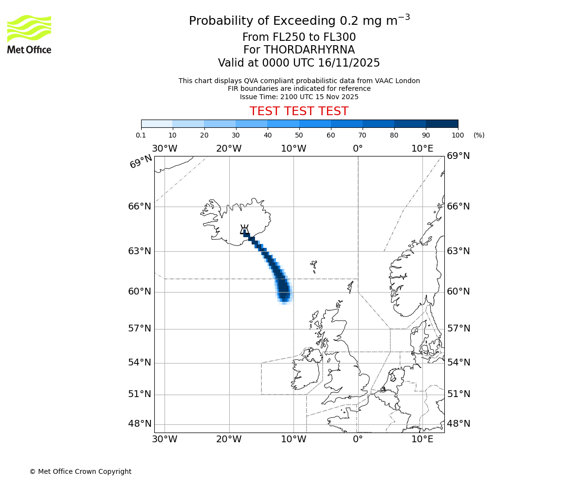 Probability of exceeding 0.2 milligrams per metre cubed. From 250 to 300 for THORDARHYRNA. Valid at 2100 UTC 15/11/2025