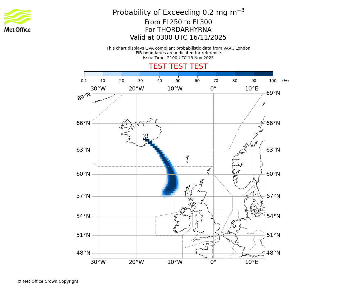 Probability of exceeding 0.2 milligrams per metre cubed. From 250 to 300 for THORDARHYRNA. Valid at 0000 UTC 16/11/2025