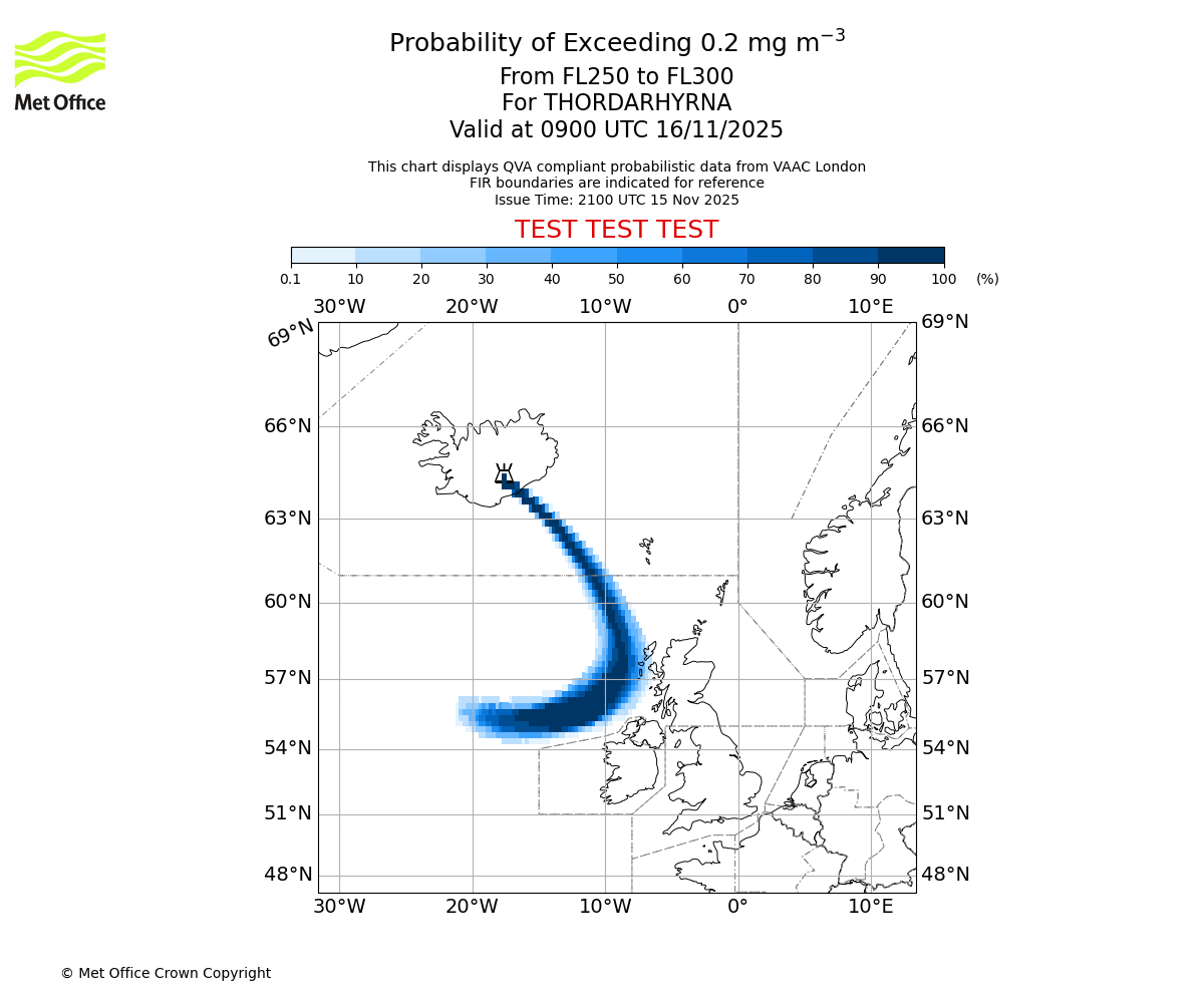 Probability of exceeding 0.2 milligrams per metre cubed. From 250 to 300 for THORDARHYRNA. Valid at 0600 UTC 16/11/2025