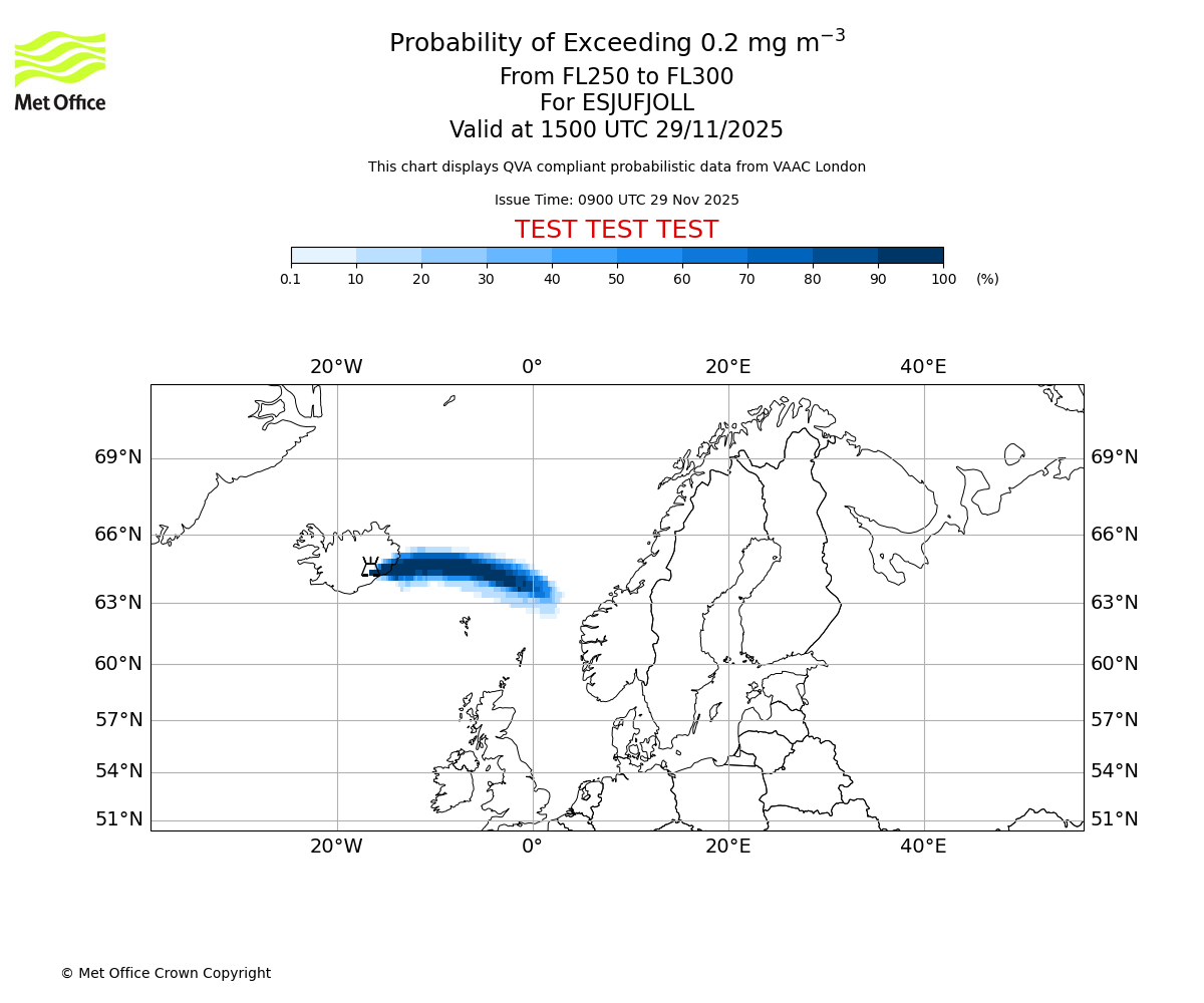 Quantitative Volcanic Ash charts (QVA) are produced in accordance with International Civil Aviation Organization (ICAO) Annex 3 requirements and are provided as well as the London Volcanic Ash Advisory Graphics (VAG) and Advisories (VAA). The lowest QVA threshold (0.2 mg/m³) matches to the areas depicted in the VAA and VAG. Both expected ash concentration and probabilistic forecast information is provided in the chart viewer below for eruptions occurring in the London Volcanic Ash Advisory Centre (VAAC) area of responsibility.