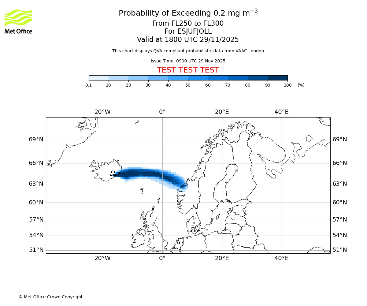 Quantitative Volcanic Ash charts (QVA) are produced in accordance with International Civil Aviation Organization (ICAO) Annex 3 requirements and are provided as well as the London Volcanic Ash Advisory Graphics (VAG) and Advisories (VAA). The lowest QVA threshold (0.2 mg/m³) matches to the areas depicted in the VAA and VAG. Both expected ash concentration and probabilistic forecast information is provided in the chart viewer below for eruptions occurring in the London Volcanic Ash Advisory Centre (VAAC) area of responsibility.