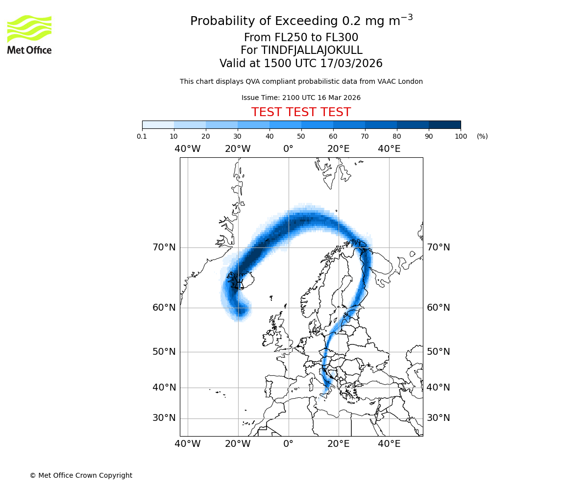 Probability of exceeding 0.2 milligrams per metre cubed. From 250 to 300 for TINDFJALLAJOKULL. Valid at 1200 UTC 17/03/2026