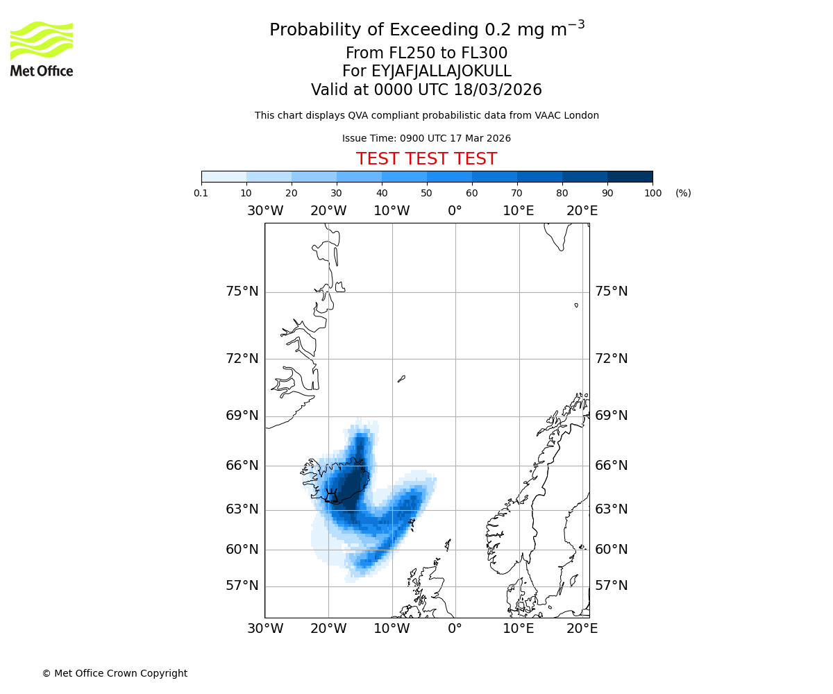 Quantitative Volcanic Ash charts (QVA) are produced in accordance with International Civil Aviation Organization (ICAO) Annex 3 requirements and are provided as well as the London Volcanic Ash Advisory Graphics (VAG) and Advisories (VAA). The lowest QVA threshold (0.2 mg/m³) matches to the areas depicted in the VAA and VAG. Both expected ash concentration and probabilistic forecast information is provided in the chart viewer below for eruptions occurring in the London Volcanic Ash Advisory Centre (VAAC) area of responsibility.