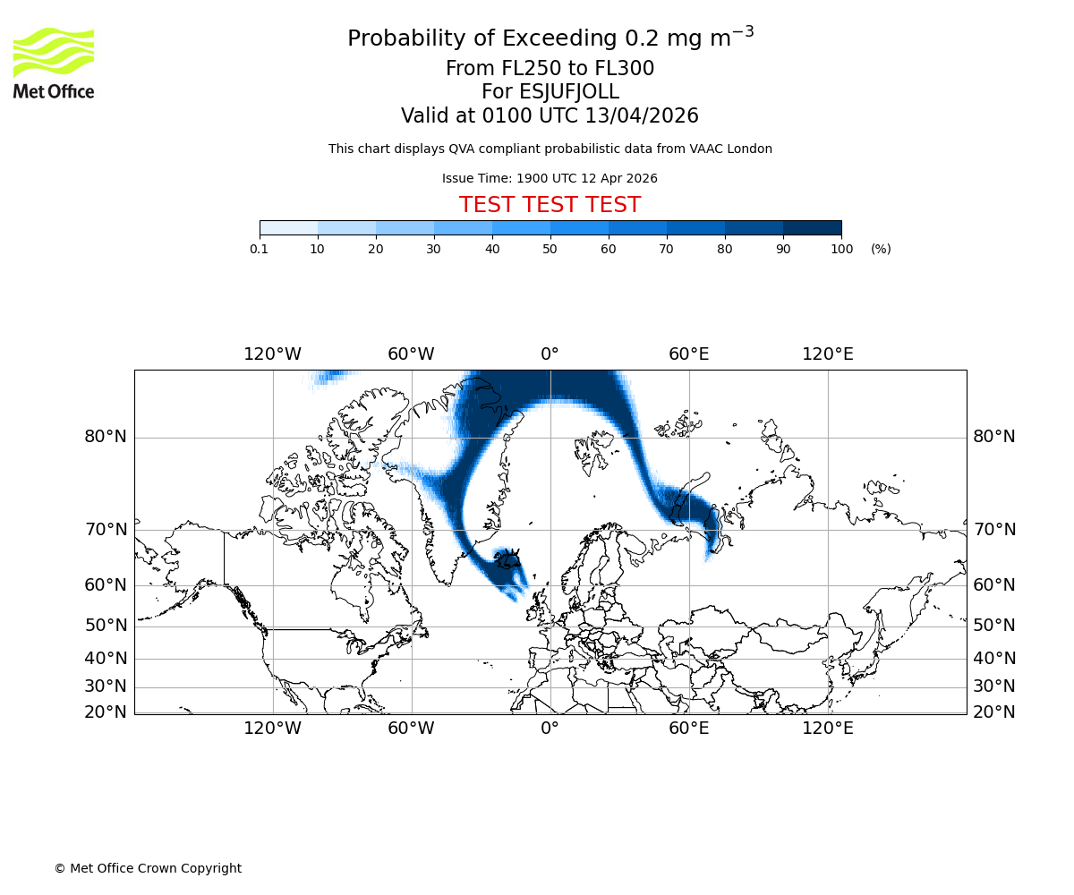 Quantitative Volcanic Ash charts (QVA) are produced in accordance with International Civil Aviation Organization (ICAO) Annex 3 requirements and are provided as well as the London Volcanic Ash Advisory Graphics (VAG) and Advisories (VAA). The lowest QVA threshold (0.2 mg/m³) matches to the areas depicted in the VAA and VAG. Both expected ash concentration and probabilistic forecast information is provided in the chart viewer below for eruptions occurring in the London Volcanic Ash Advisory Centre (VAAC) area of responsibility.