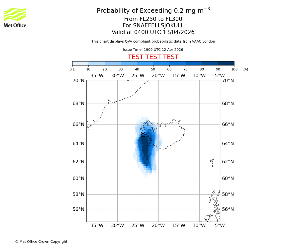 Quantitative Volcanic Ash charts (QVA) are produced in accordance with International Civil Aviation Organization (ICAO) Annex 3 requirements and are provided as well as the London Volcanic Ash Advisory Graphics (VAG) and Advisories (VAA). The lowest QVA threshold (0.2 mg/m³) matches to the areas depicted in the VAA and VAG. Both expected ash concentration and probabilistic forecast information is provided in the chart viewer below for eruptions occurring in the London Volcanic Ash Advisory Centre (VAAC) area of responsibility.