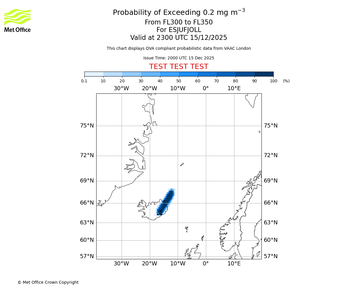 Probability of exceeding 0.2 milligrams per metre cubed. From 300 to 350 for ESJUFJOLL. Valid at 2000 UTC 15/12/2025
