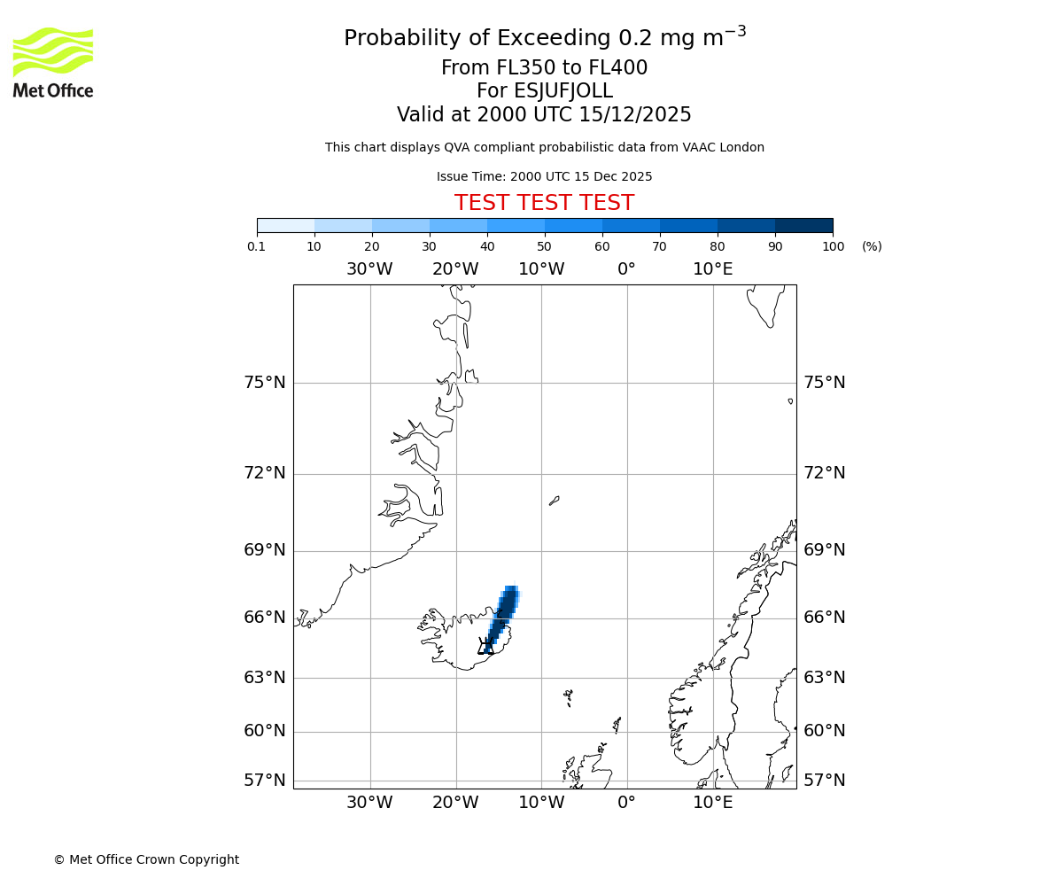 Quantitative Volcanic Ash charts (QVA) are produced in accordance with International Civil Aviation Organization (ICAO) Annex 3 requirements and are provided as well as the London Volcanic Ash Advisory Graphics (VAG) and Advisories (VAA). The lowest QVA threshold (0.2 mg/m³) matches to the areas depicted in the VAA and VAG. Both expected ash concentration and probabilistic forecast information is provided in the chart viewer below for eruptions occurring in the London Volcanic Ash Advisory Centre (VAAC) area of responsibility.