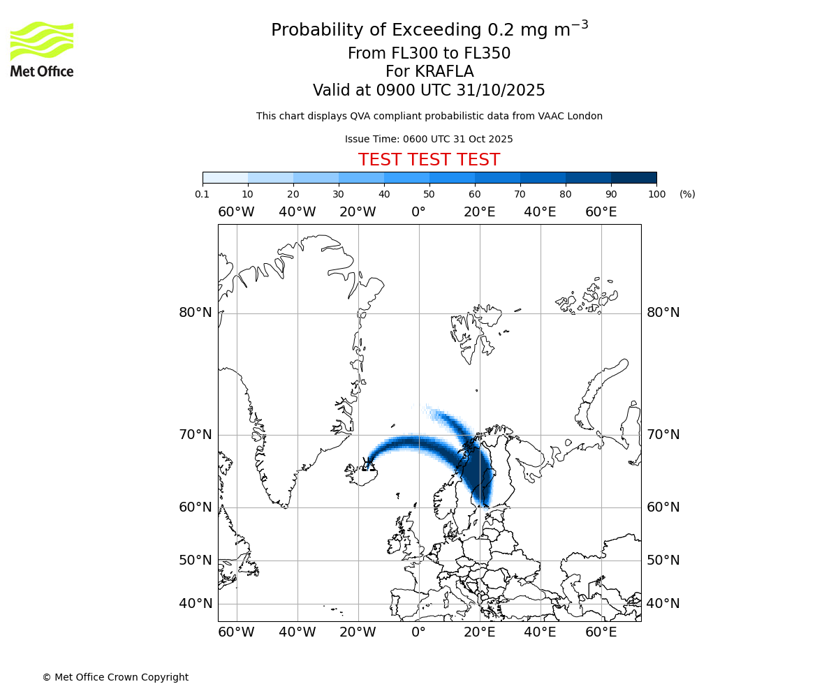 Probability of exceeding 0.2 milligrams per metre cubed. From 300 to 350 for KRAFLA. Valid at 0600 UTC 31/10/2025