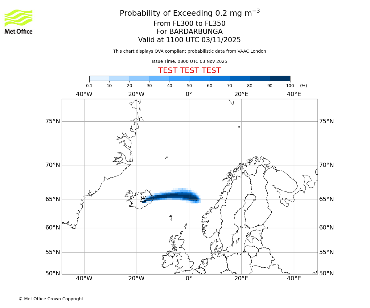 Probability of exceeding 0.2 milligrams per metre cubed. From 300 to 350 for BARDARBUNGA. Valid at 0800 UTC 03/11/2025