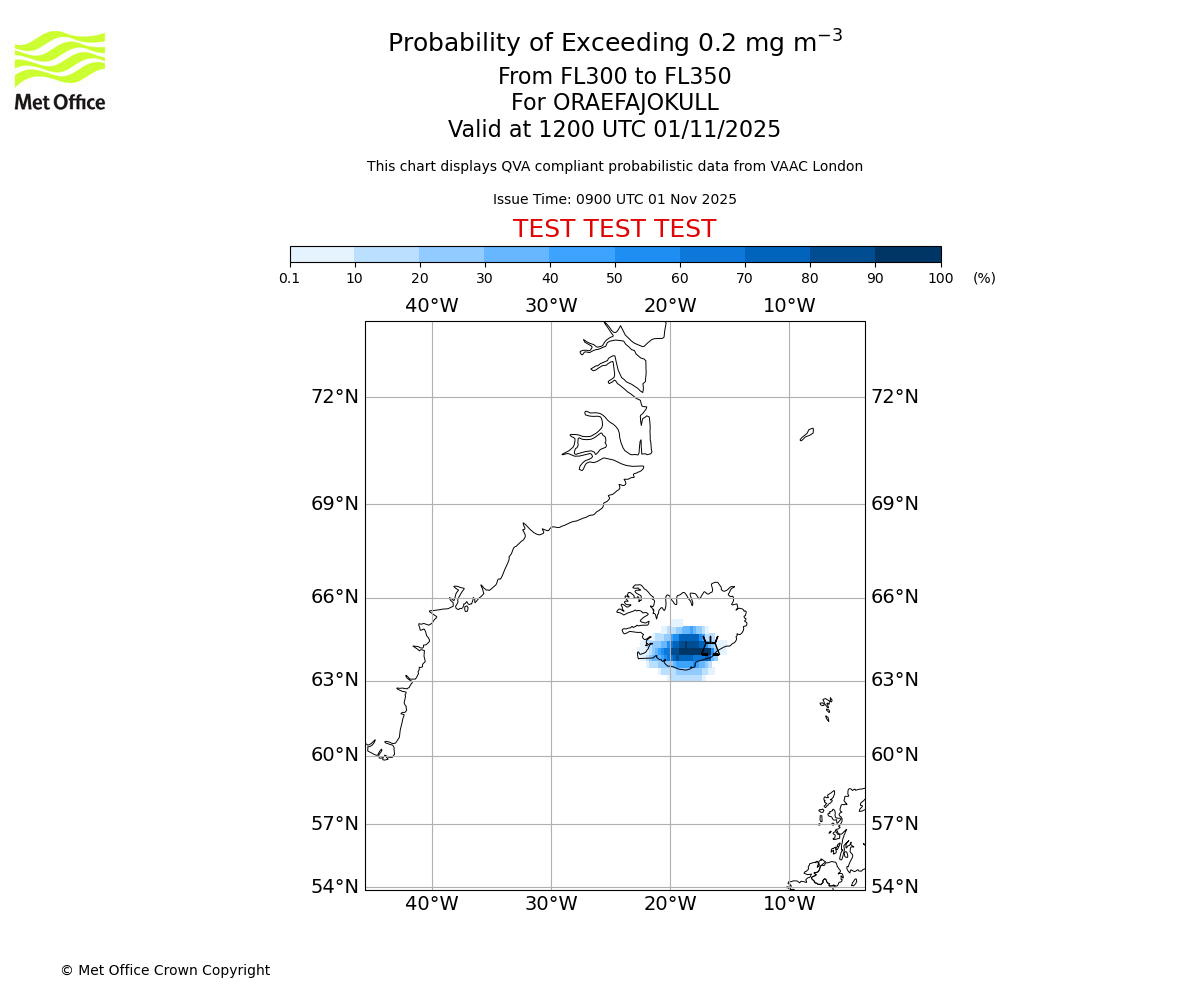 Probability of exceeding 0.2 milligrams per metre cubed. From 300 to 350 for ORAEFAJOKULL. Valid at 0900 UTC 01/11/2025