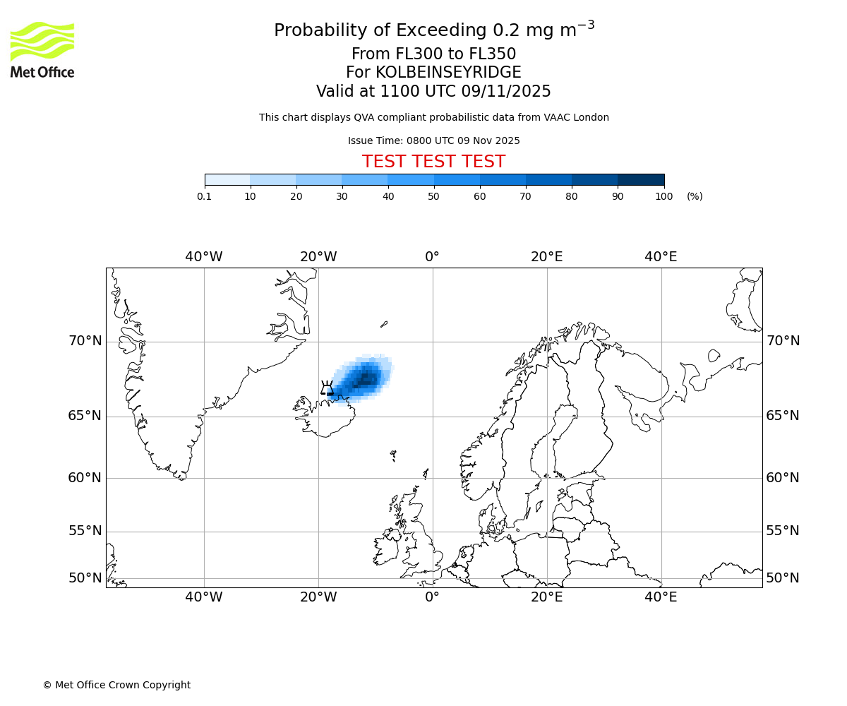 Probability of exceeding 0.2 milligrams per metre cubed. From 300 to 350 for KOLBEINSEYRIDGE. Valid at 0800 UTC 09/11/2025