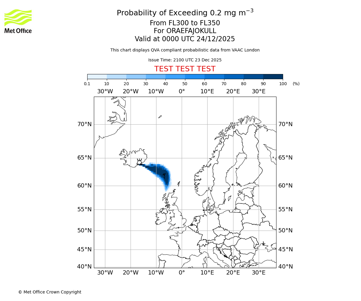 Probability of exceeding 0.2 milligrams per metre cubed. From 300 to 350 for ORAEFAJOKULL. Valid at 2100 UTC 23/12/2025