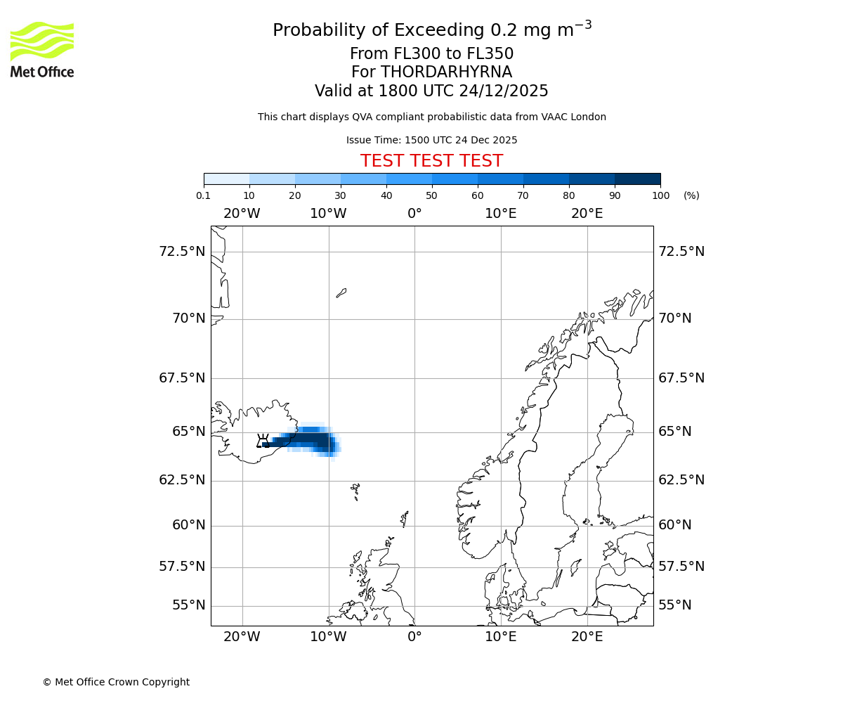 Probability of exceeding 0.2 milligrams per metre cubed. From 300 to 350 for THORDARHYRNA. Valid at 1500 UTC 24/12/2025