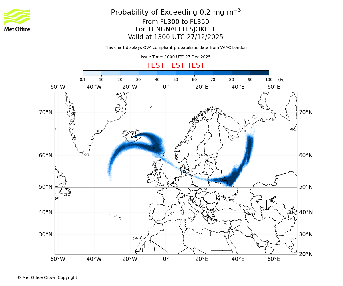 Probability of exceeding 0.2 milligrams per metre cubed. From 300 to 350 for TUNGNAFELLSJOKULL. Valid at 1000 UTC 27/12/2025