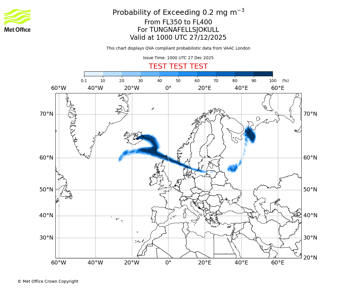 Modelled ash concentration from 000 to 200 for TUNGNAFELLSJOKULL. Valid at 1000 UTC 27/12/2025