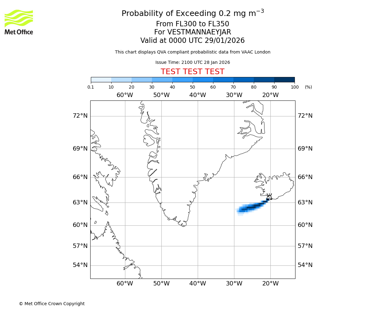 Probability of exceeding 0.2 milligrams per metre cubed. From 300 to 350 for VESTMANNAEYJAR. Valid at 2100 UTC 28/01/2026