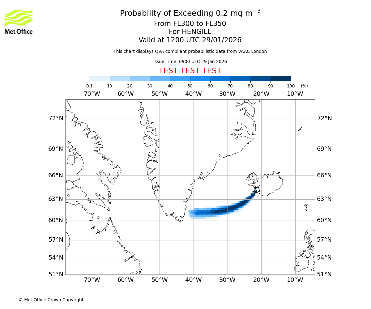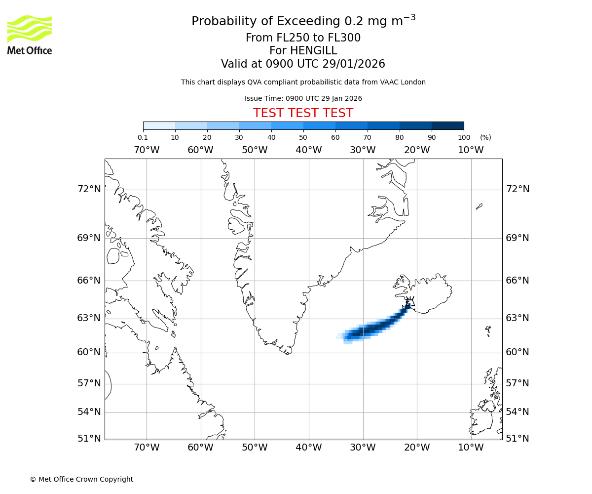 Probability of exceeding 0.2 milligrams per metre cubed. From 300 to 350 for HENGILL. Valid at 0900 UTC 29/01/2026
