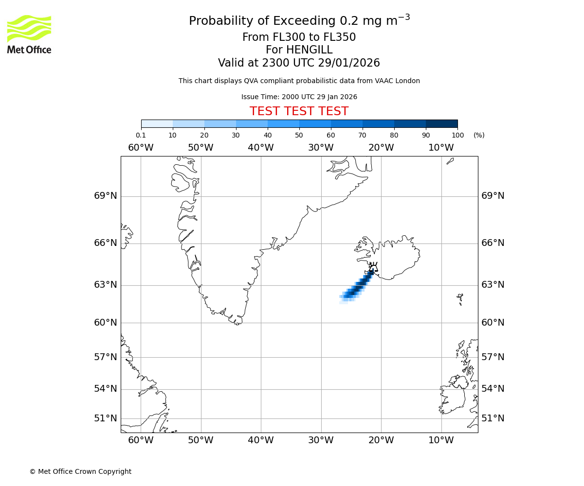 Probability of exceeding 0.2 milligrams per metre cubed. From 300 to 350 for HENGILL. Valid at 2000 UTC 29/01/2026