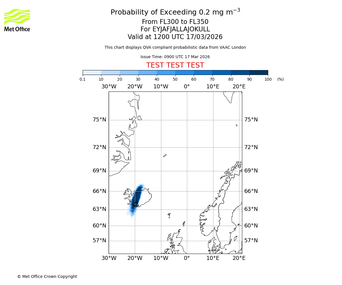 Probability of exceeding 0.2 milligrams per metre cubed. From 300 to 350 for EYJAFJALLAJOKULL. Valid at 0900 UTC 17/03/2026