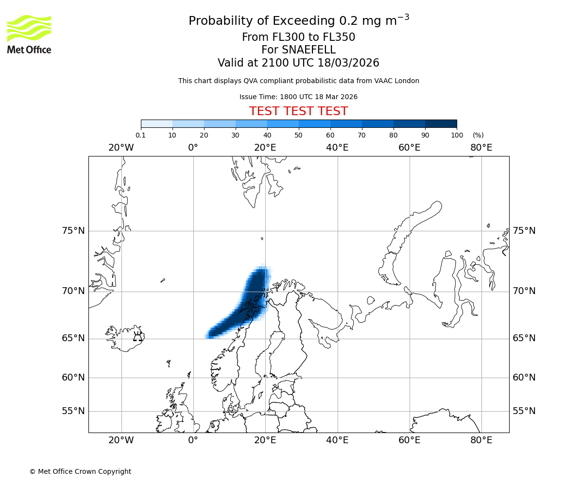 Probability of exceeding 0.2 milligrams per metre cubed. From 300 to 350 for SNAEFELL. Valid at 1800 UTC 18/03/2026