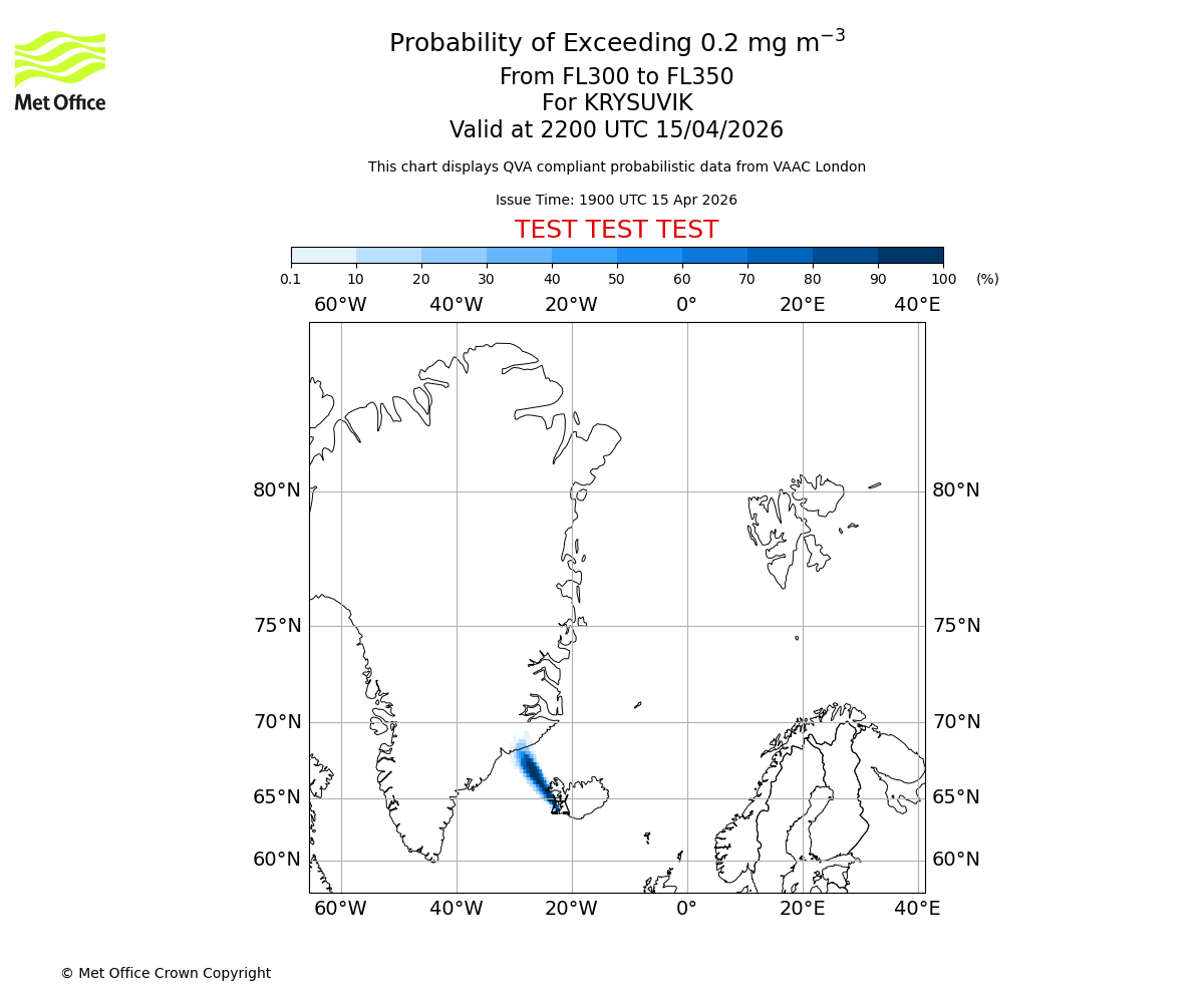 Probability of exceeding 0.2 milligrams per metre cubed. From 300 to 350 for KRYSUVIK. Valid at 1900 UTC 15/04/2026
