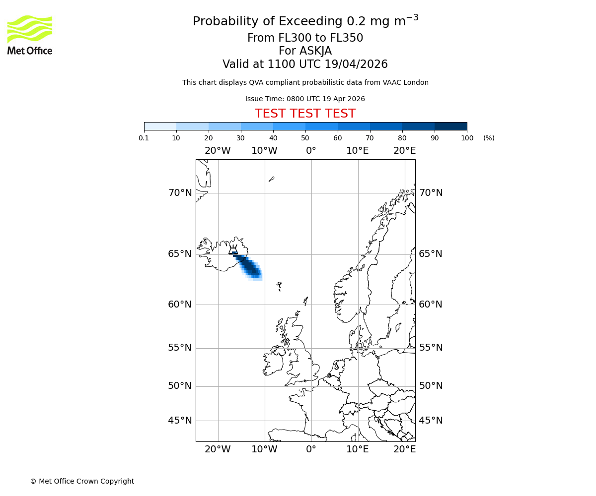 Probability of exceeding 0.2 milligrams per metre cubed. From 300 to 350 for ASKJA. Valid at 0800 UTC 19/04/2026