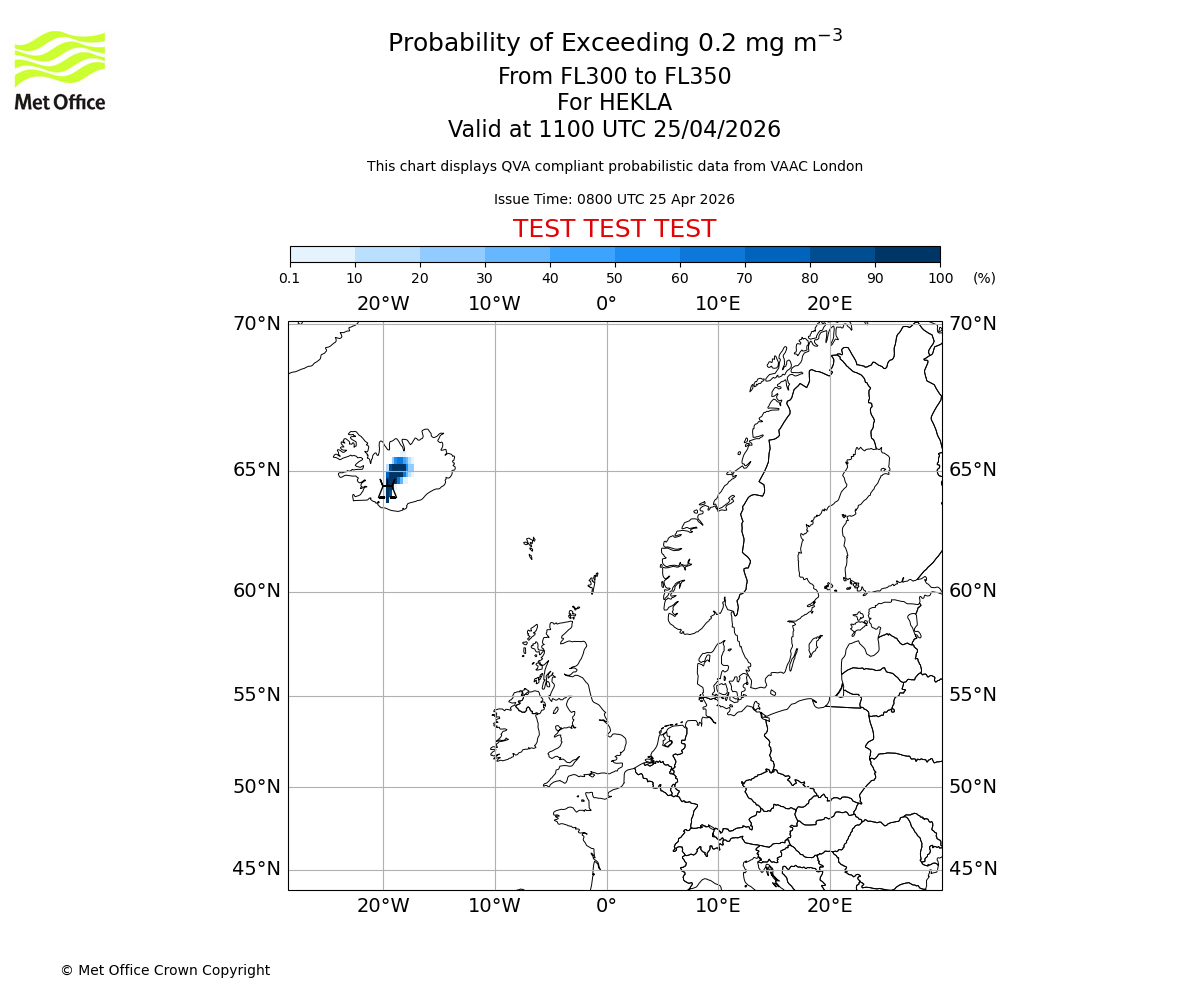 Probability of exceeding 0.2 milligrams per metre cubed. From 300 to 350 for HEKLA. Valid at 0800 UTC 25/04/2026