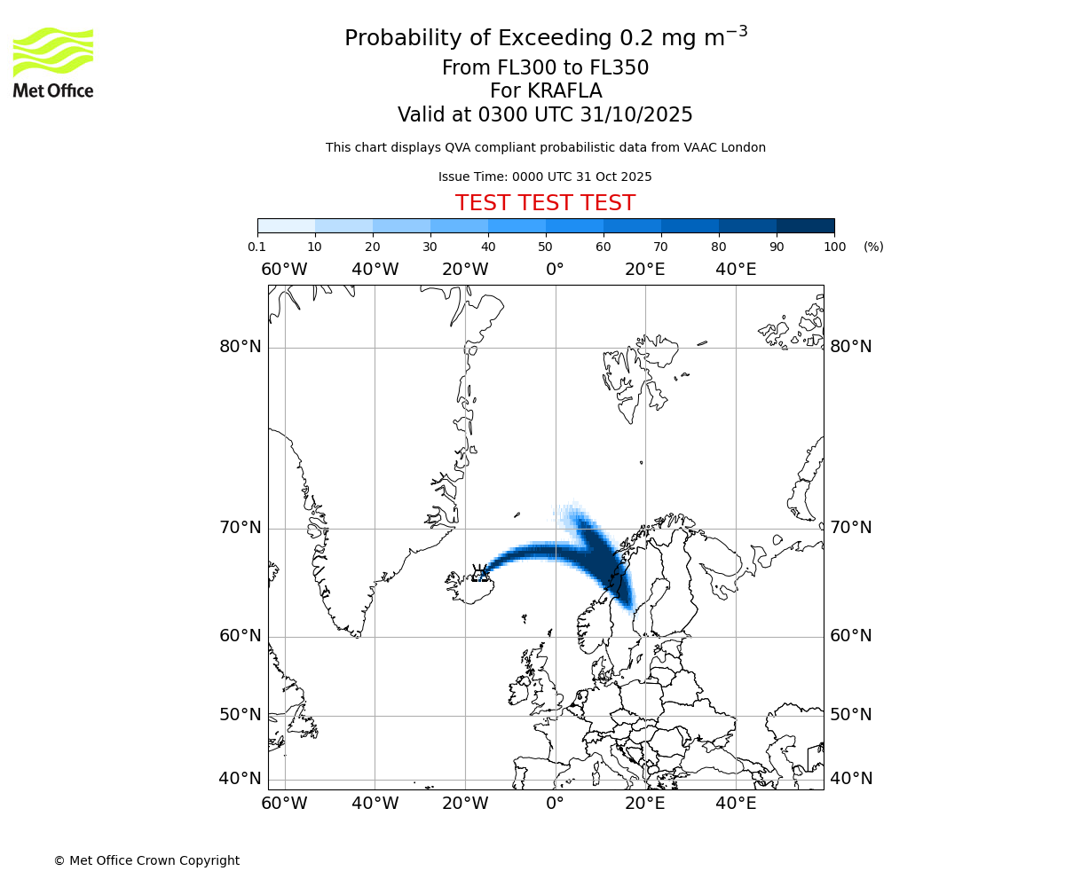 Probability of exceeding 0.2 milligrams per metre cubed. From 300 to 350 for KRAFLA. Valid at 0000 UTC 31/10/2025