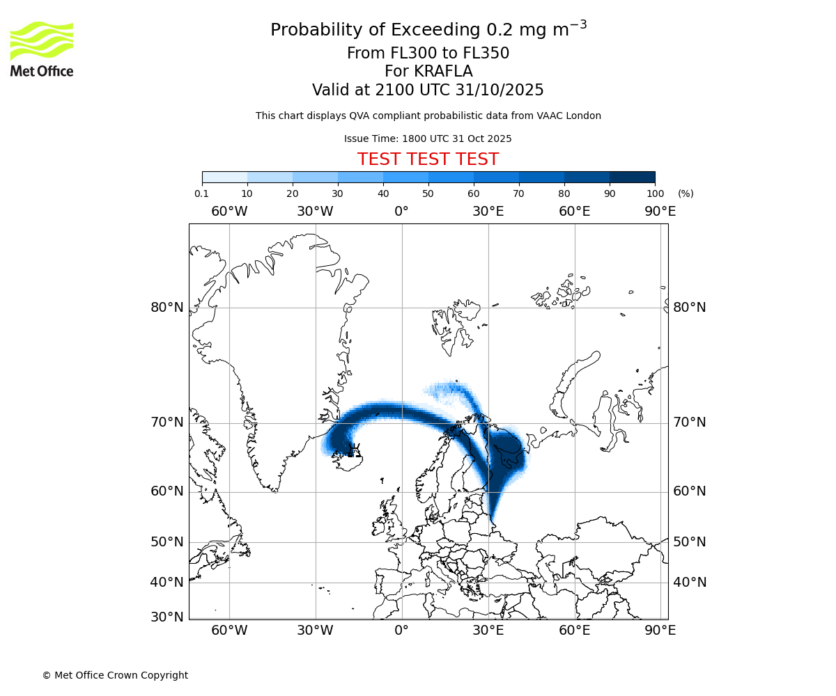 Probability of exceeding 0.2 milligrams per metre cubed. From 300 to 350 for KRAFLA. Valid at 1800 UTC 31/10/2025