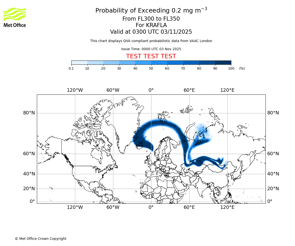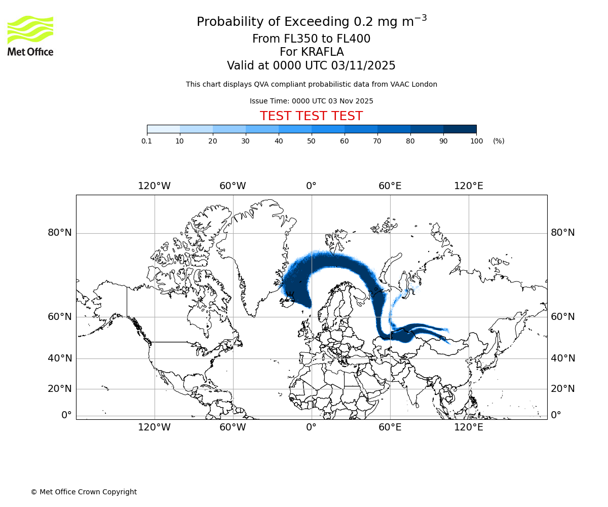 In accordance with ICAO Annex 3, Amendment 82 VAAC London will provide operational QVA forecasts from 27 November 2025 and these will be made available via a VAAC London QVA API information service. These charts are currently provided for test and evaluation purposes (not for operational use) until the introduction of the operational service.