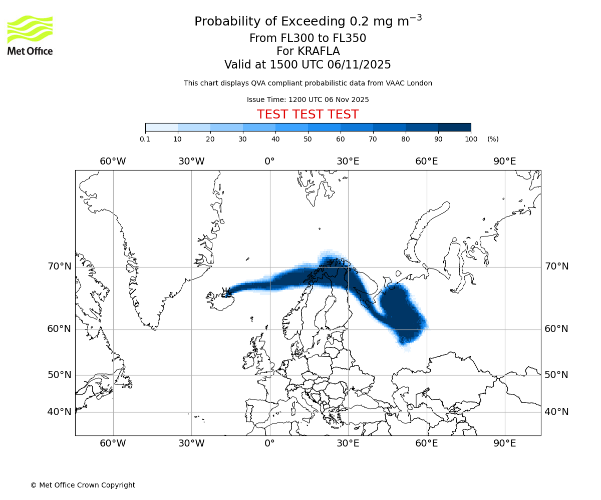In accordance with ICAO Annex 3, Amendment 82 VAAC London will provide operational QVA forecasts from 27 November 2025 and these will be made available via a VAAC London QVA API information service. These charts are currently provided for test and evaluation purposes (not for operational use) until the introduction of the operational service.