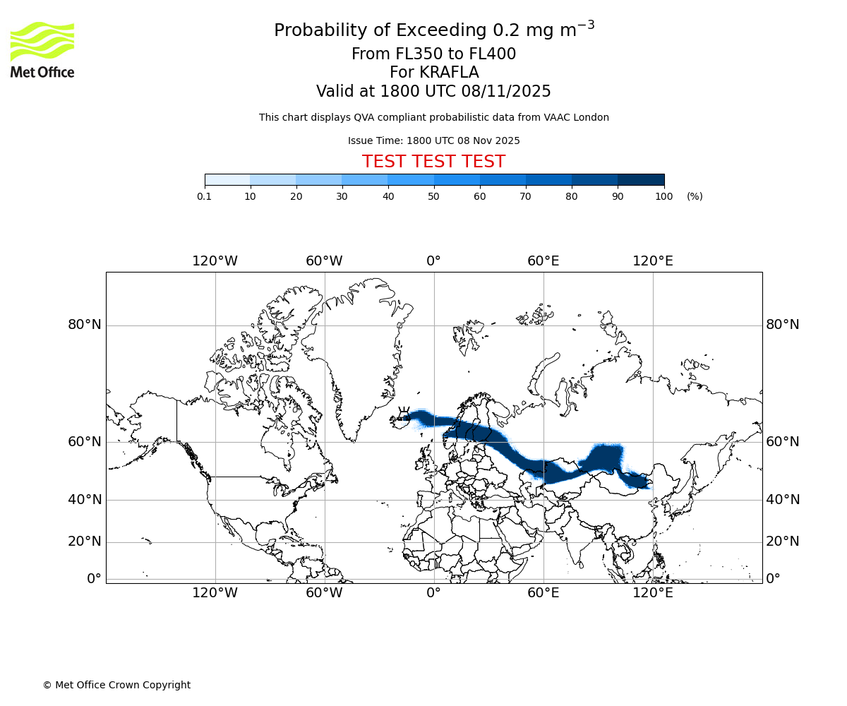 In accordance with ICAO Annex 3, Amendment 82 VAAC London will provide operational QVA forecasts from 27 November 2025 and these will be made available via a VAAC London QVA API information service. These charts are currently provided for test and evaluation purposes (not for operational use) until the introduction of the operational service.