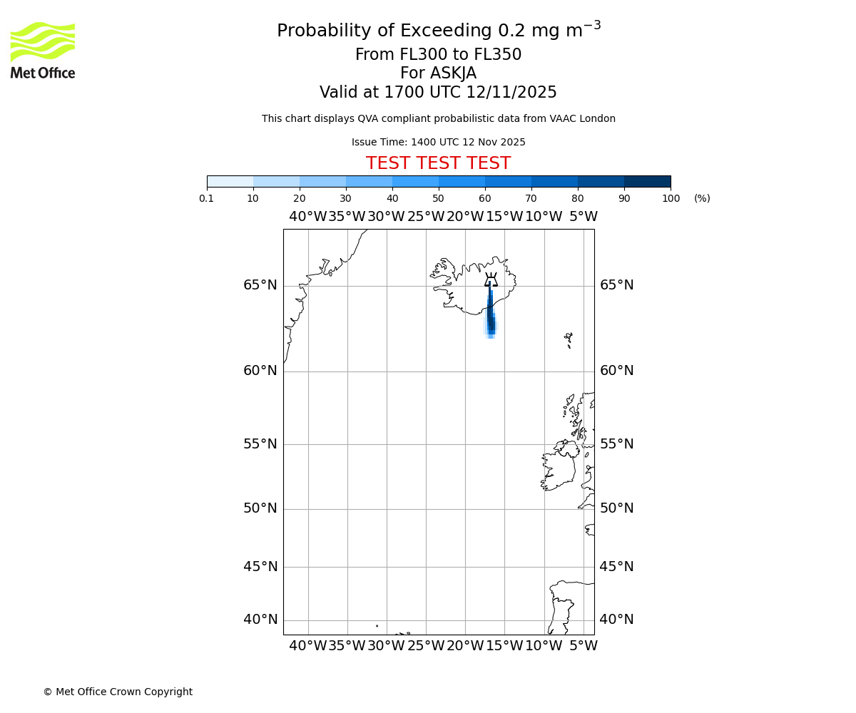 Probability of exceeding 0.2 milligrams per metre cubed. From 300 to 350 for ASKJA. Valid at 1400 UTC 12/11/2025