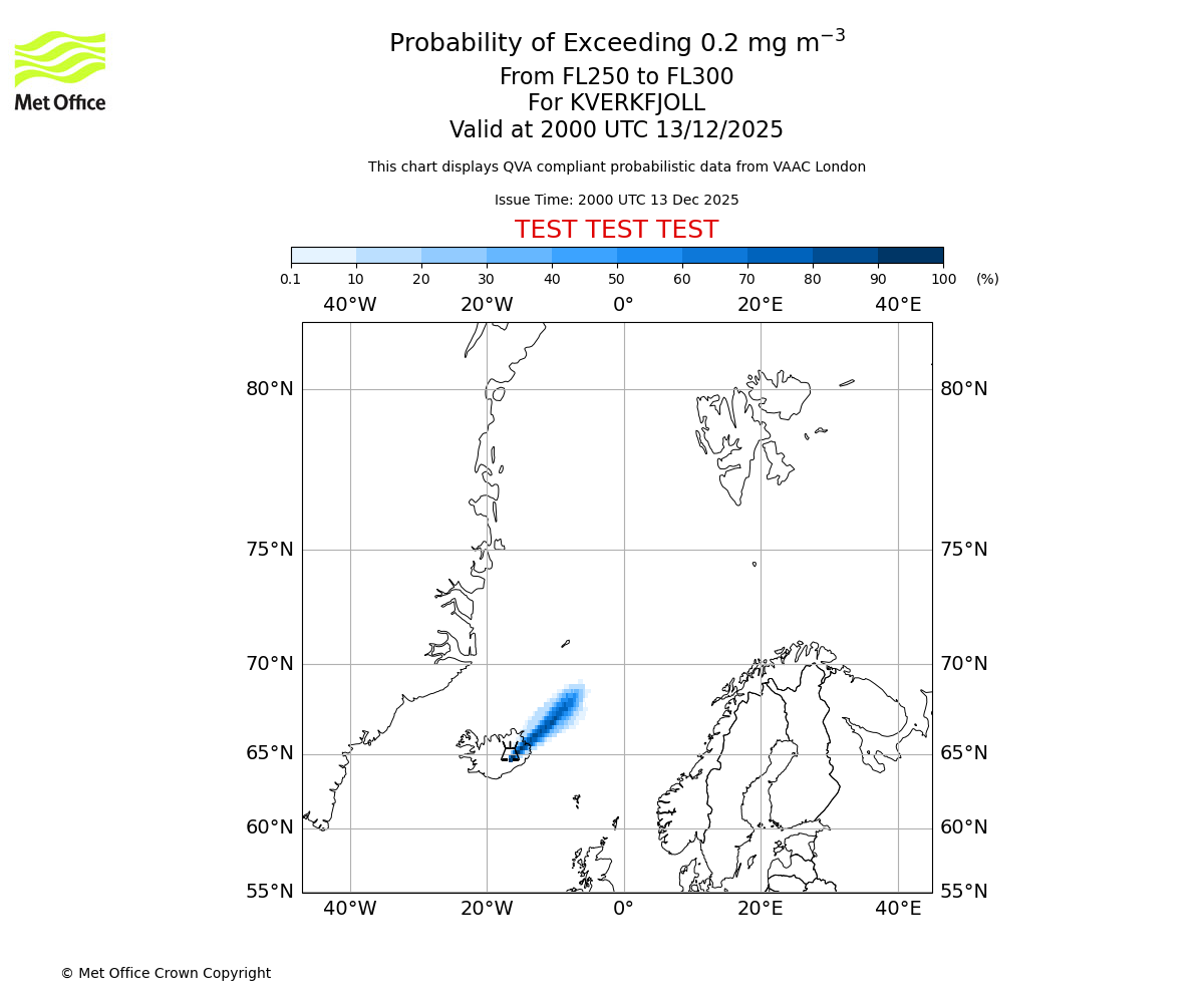 Modelled ash concentration from 000 to 050 for KVERKFJOLL. Valid at 2000 UTC 13/12/2025