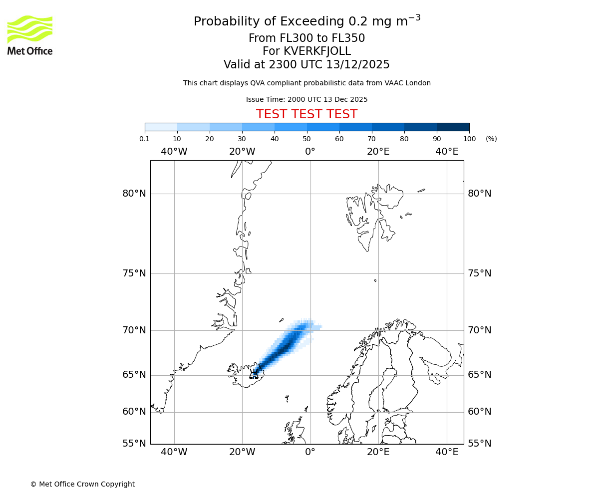 Probability of exceeding 0.2 milligrams per metre cubed. From 300 to 350 for KVERKFJOLL. Valid at 2000 UTC 13/12/2025