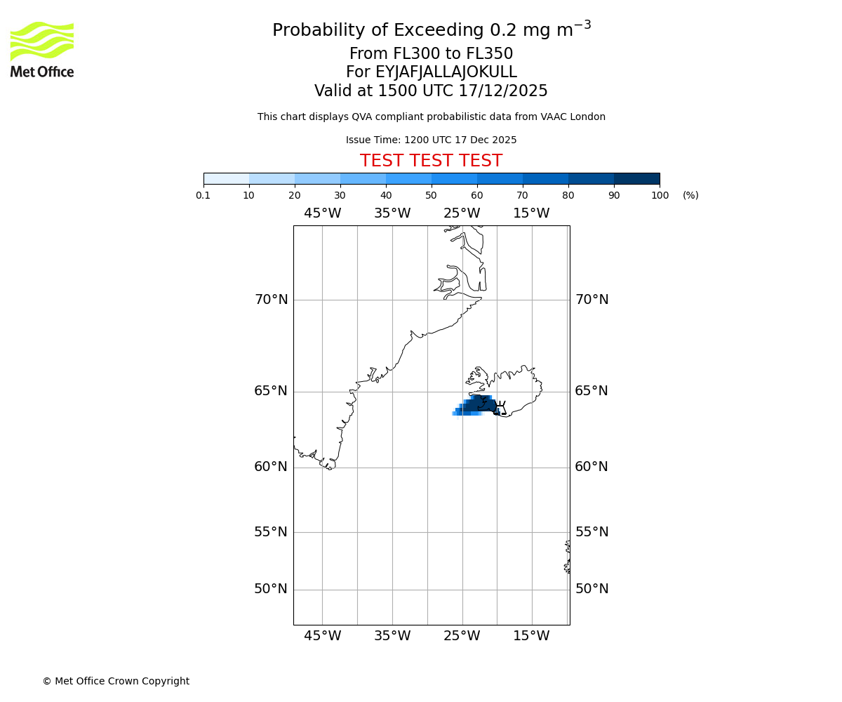 Probability of exceeding 0.2 milligrams per metre cubed. From 300 to 350 for EYJAFJALLAJOKULL. Valid at 1200 UTC 17/12/2025