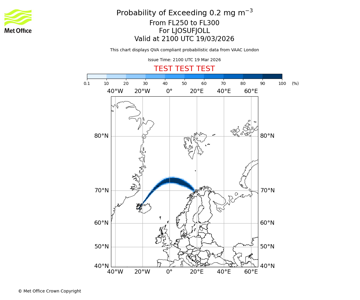 Quantitative Volcanic Ash charts (QVA) are produced in accordance with International Civil Aviation Organization (ICAO) Annex 3 requirements and are provided as well as the London Volcanic Ash Advisory Graphics (VAG) and Advisories (VAA). The lowest QVA threshold (0.2 mg/m³) matches to the areas depicted in the VAA and VAG. Both expected ash concentration and probabilistic forecast information is provided in the chart viewer below for eruptions occurring in the London Volcanic Ash Advisory Centre (VAAC) area of responsibility.