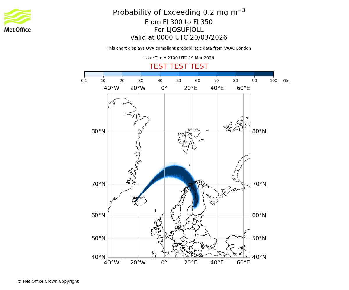 Probability of exceeding 0.2 milligrams per metre cubed. From 300 to 350 for LJOSUFJOLL. Valid at 2100 UTC 19/03/2026