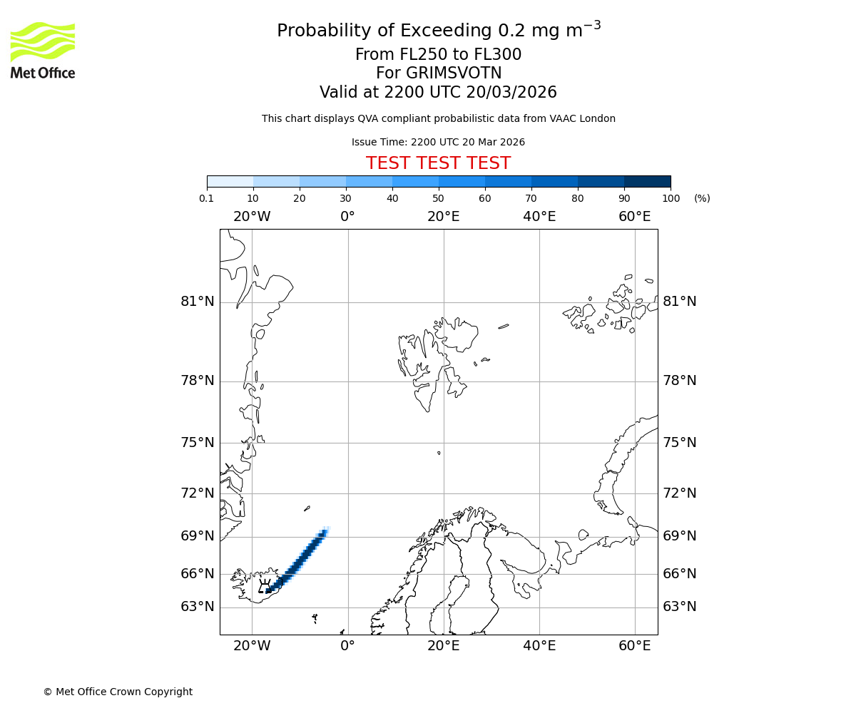 Quantitative Volcanic Ash charts (QVA) are produced in accordance with International Civil Aviation Organization (ICAO) Annex 3 requirements and are provided as well as the London Volcanic Ash Advisory Graphics (VAG) and Advisories (VAA). The lowest QVA threshold (0.2 mg/m³) matches to the areas depicted in the VAA and VAG. Both expected ash concentration and probabilistic forecast information is provided in the chart viewer below for eruptions occurring in the London Volcanic Ash Advisory Centre (VAAC) area of responsibility.