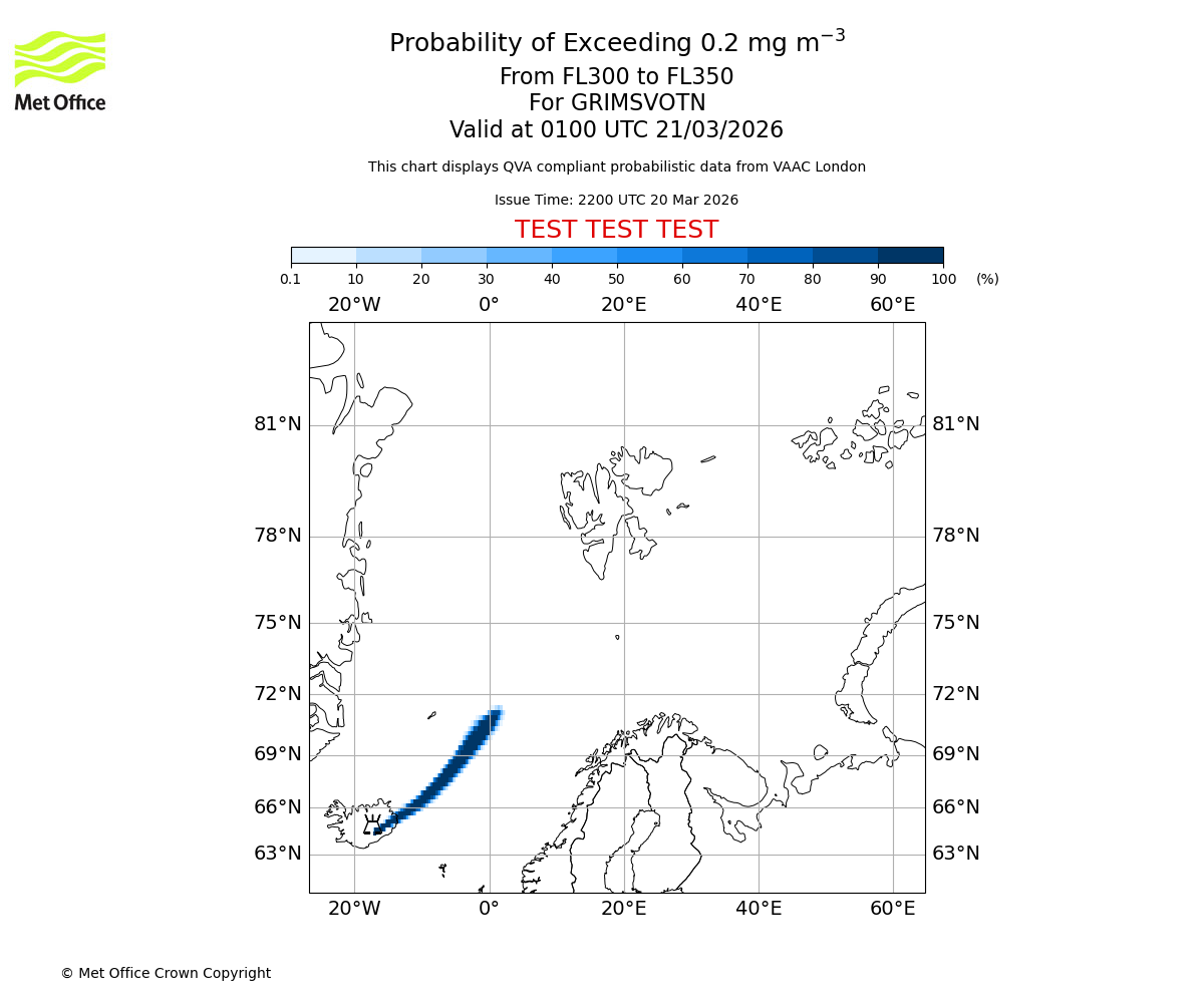 Probability of exceeding 0.2 milligrams per metre cubed. From 300 to 350 for GRIMSVOTN. Valid at 2200 UTC 20/03/2026