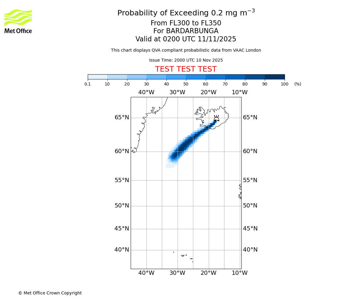 Probability of exceeding 0.2 milligrams per metre cubed. From 300 to 350 for BARDARBUNGA. Valid at 2300 UTC 10/11/2025