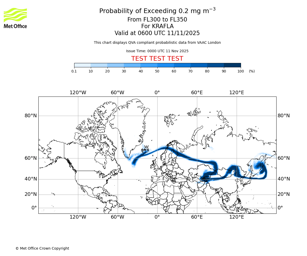 In accordance with ICAO Annex 3, Amendment 82 VAAC London will provide operational QVA forecasts from 27 November 2025 and these will be made available via a VAAC London QVA API information service. These charts are currently provided for test and evaluation purposes (not for operational use) until the introduction of the operational service.