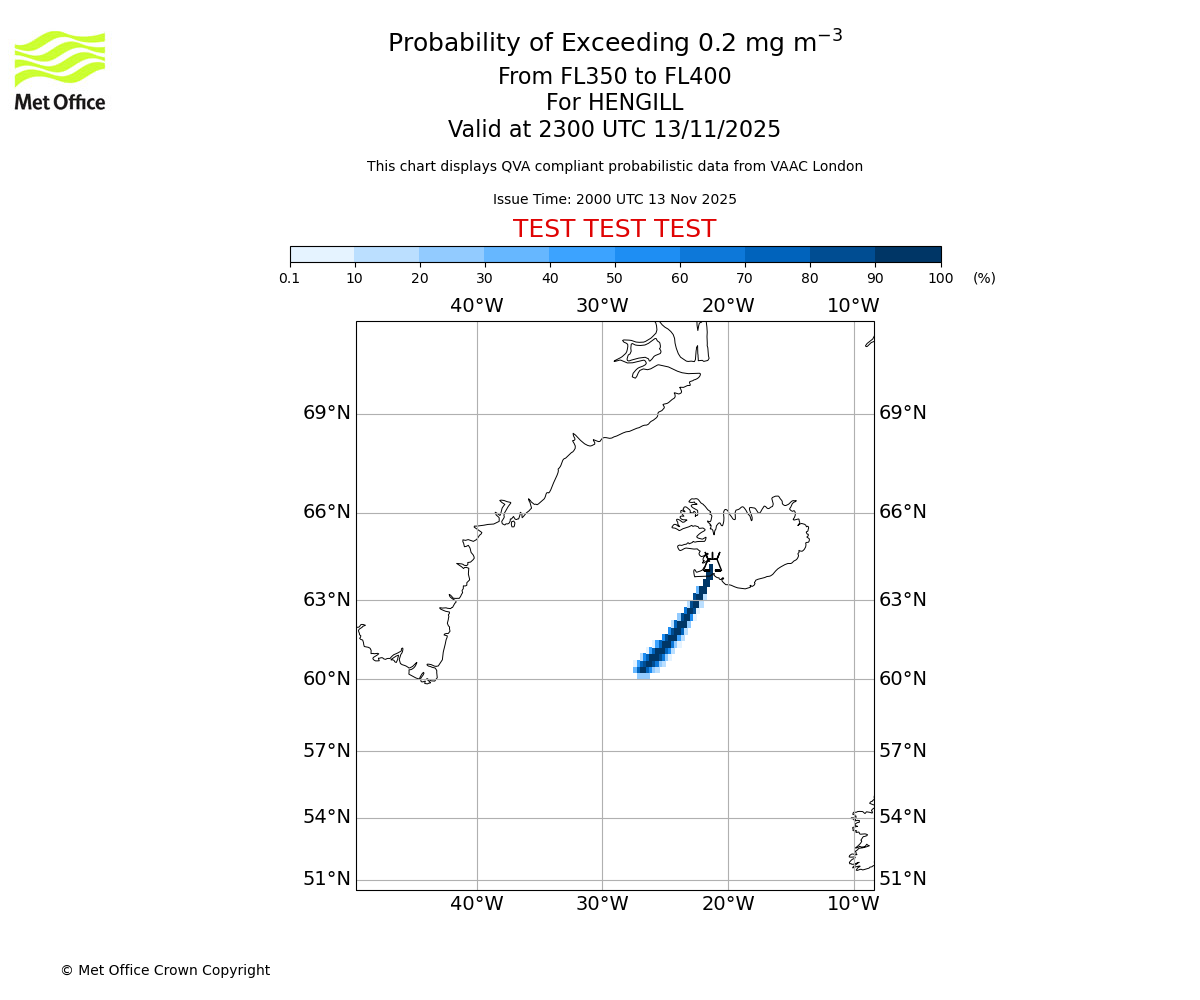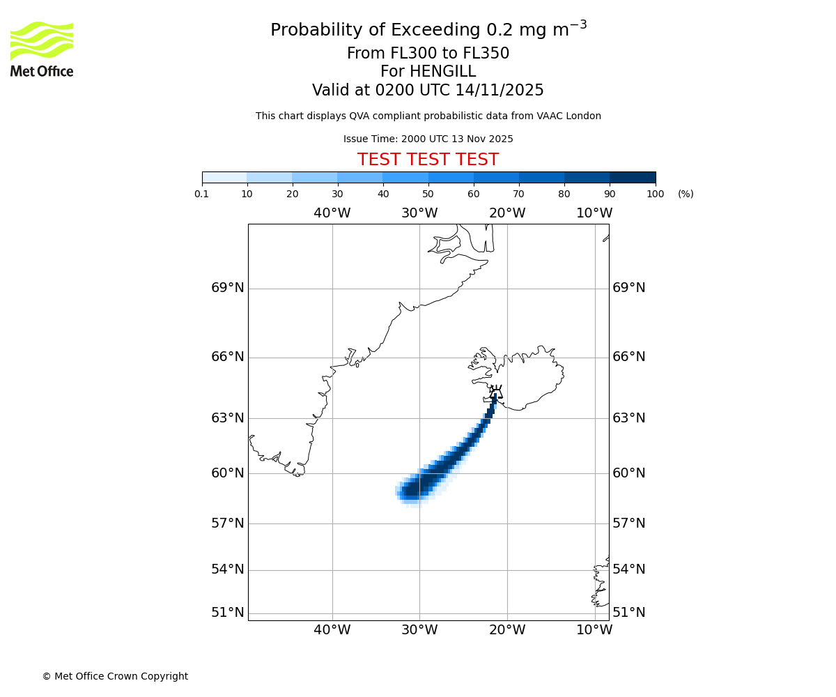 Probability of exceeding 0.2 milligrams per metre cubed. From 300 to 350 for HENGILL. Valid at 2300 UTC 13/11/2025