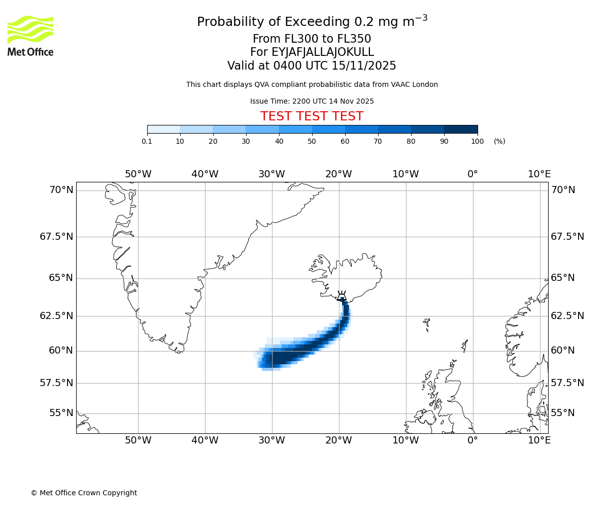 Probability of exceeding 0.2 milligrams per metre cubed. From 300 to 350 for EYJAFJALLAJOKULL. Valid at 0100 UTC 15/11/2025