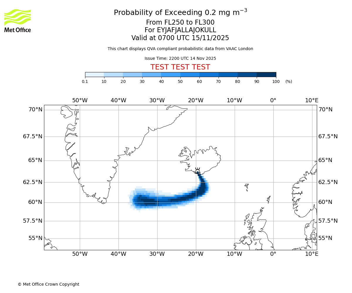 Probability of exceeding 0.2 milligrams per metre cubed. From 300 to 350 for EYJAFJALLAJOKULL. Valid at 0700 UTC 15/11/2025