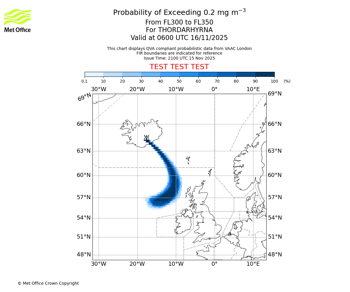 Probability of exceeding 0.2 milligrams per metre cubed. From 300 to 350 for THORDARHYRNA. Valid at 0300 UTC 16/11/2025