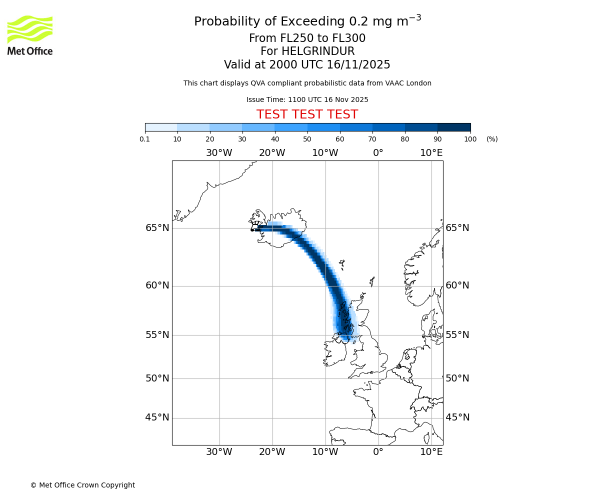 Modelled ash concentration from 000 to 200 for HELGRINDUR. Valid at 1100 UTC 16/11/2025