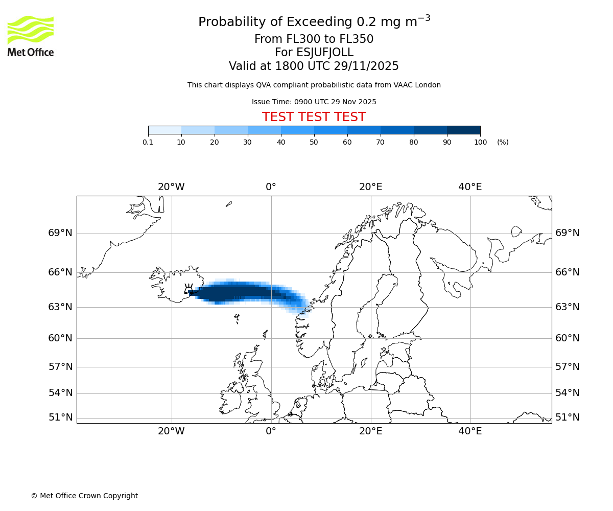 Quantitative Volcanic Ash charts (QVA) are produced in accordance with International Civil Aviation Organization (ICAO) Annex 3 requirements and are provided as well as the London Volcanic Ash Advisory Graphics (VAG) and Advisories (VAA). The lowest QVA threshold (0.2 mg/m³) matches to the areas depicted in the VAA and VAG. Both expected ash concentration and probabilistic forecast information is provided in the chart viewer below for eruptions occurring in the London Volcanic Ash Advisory Centre (VAAC) area of responsibility.